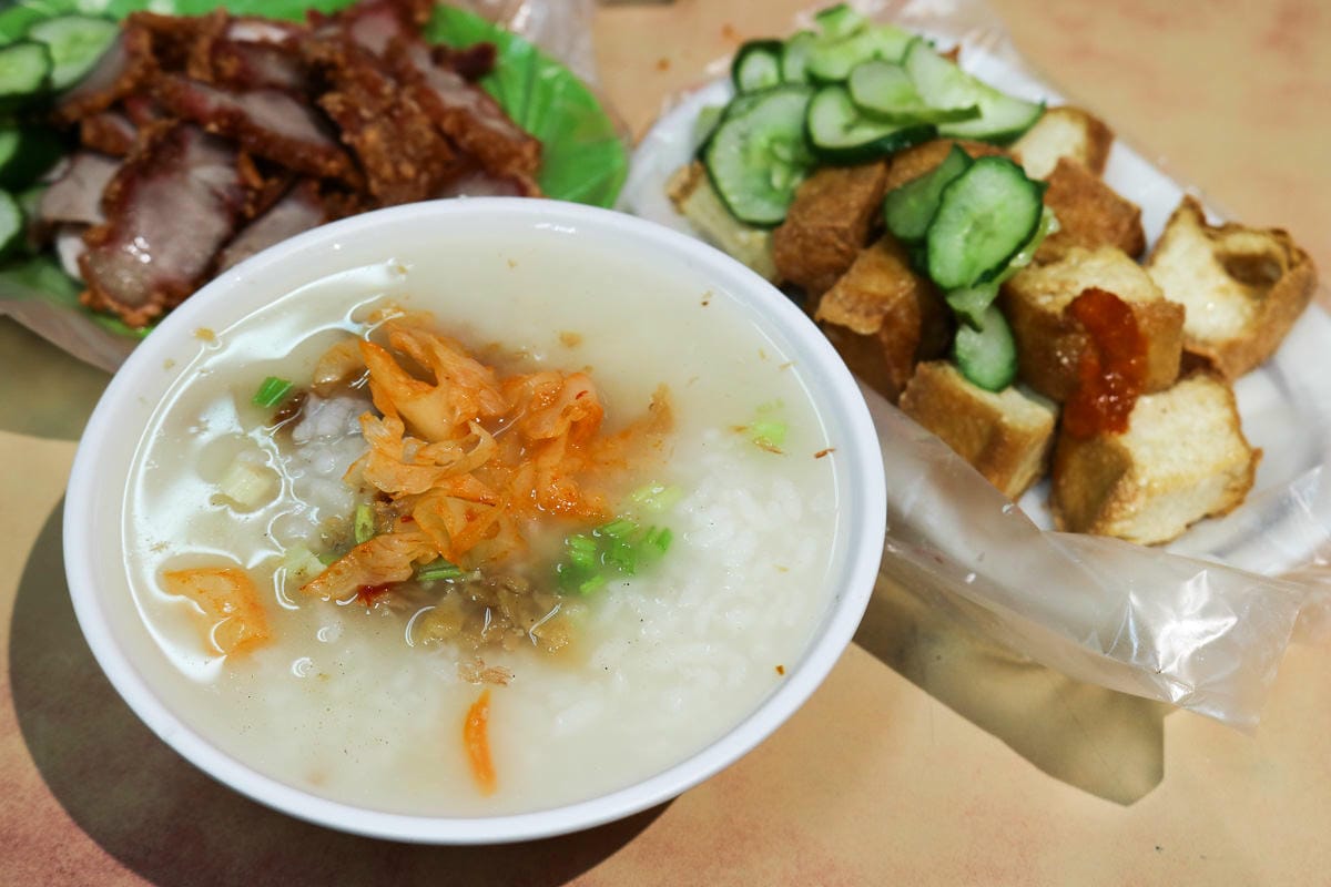 醃蘿蔔乾、紅蔥頭、香菇、紅蘿蔔絲,燙得感覺一入喉就燒傷了 XD ,湯底香甜,生米直接煮成的粥,邊吹涼邊喝,蘿蔔乾的口感、芹菜末的提味,好喝!已經燙到不能自己的時候,吃點炸豆腐、醃漬的小黃瓜,四處張望一下其他人都吃些什麼,肉粥跟紅燒肉點播率超高。