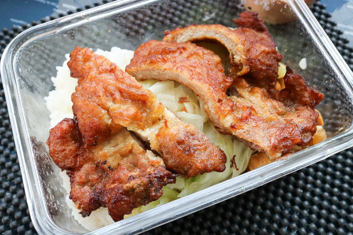 炸豬排是醃漬過的豬肉片(無骨)直接下去油炸,沒有太多粉,很像家裡會做的煎豬排,口味偏重,很下飯。最近去買便當覺得配菜色澤稍微下坡,可能最近天災蔬菜大漲吧!希望水準能趕緊恢復。