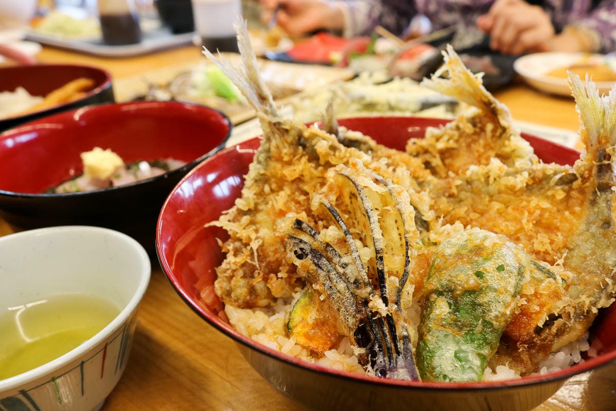 下圖:こうらく食堂的炸蝦飯,1,000 日幣出頭的炸蝦飯有 3 隻,白米飯的甜味在口中散開,慢慢的吃,屁股都不想離開椅子了