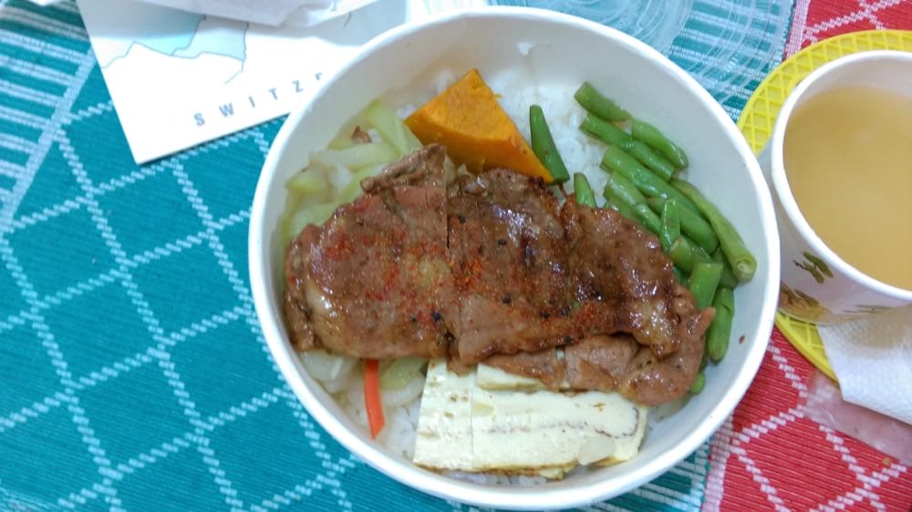 梅花燒肉丼 NT90:四樣配菜、一個湯加上主菜。台式玉子燒軟嫩味足,其他兩款青菜都是家常口味、不油不膩,底下的白飯跟喜園燒臘相仿。份量對一個大男生來說大概7分,大胃王的你別忘弄個小點心吧。總覺得這梅花肉片有些薄、不似溫體肉,90元還是別要求了。大雨之日不開伙,有不錯家常便當吃就偷笑了。沒想到手機照片放大一看真落漆,請見諒。