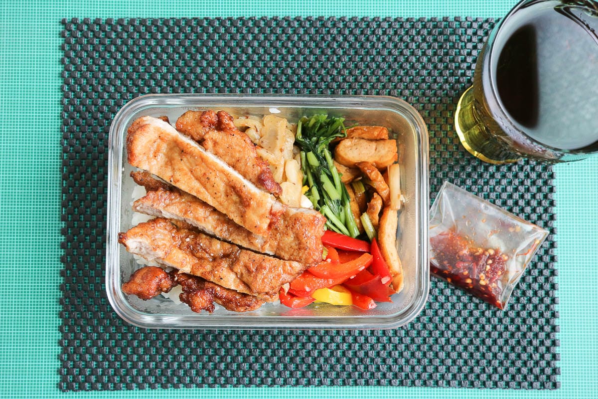 老蝦選擇的配菜有炒豆乾(先炸過再炒、彩椒、空心菜與苦瓜),都是夏天常見消暑蔬菜,吃完的玻璃盒底部沒有滿滿油,老蝦表示滿意!