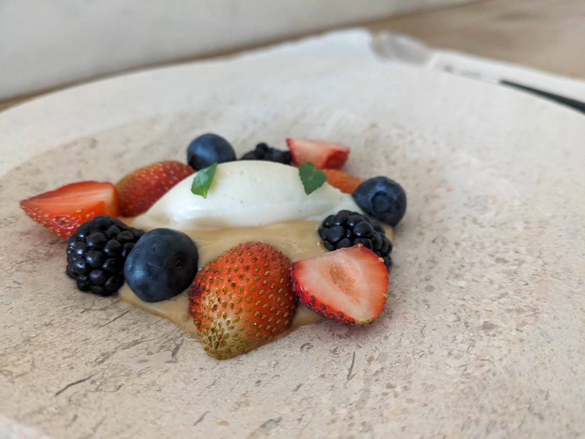 很喜歡「LEON 餐廳 Lumière」的布拉塔水果沙拉,用西班牙冷湯做底,鹹湯但是帶著水果甜味,非常消暑解渴,推薦。