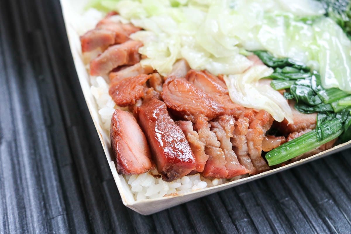紅燒肉飯NT85:三樣配菜、滷汁、切得薄得透光的紅燒肉,每一塊都帶軟骨,假牙的朋友要小心。三樣配菜沒有綠色菜葉,我想還在颱風菜價問題吧(不過頂尖排骨就是有高麗菜咩!)。圓環肉羹便當的米飯足量、紅燒肉調味偏淡,瘦肉比例偏高,榨菜、麵輪(不錯吃)、胡瓜,對我來說就是便當界的清粥小菜。