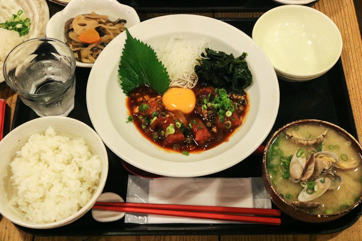 上圖:隔壁桌日本小哥的宮崎鮪魚月見定食,看起來超級可口,看看右下角的味噌湯蛤蜊根本比湯多吧!趁小哥離開位子去洗手間,詢問小哥的漂亮女伴是否願意借我拍這看起來超威的定食,學日文就是要用在這個時候!